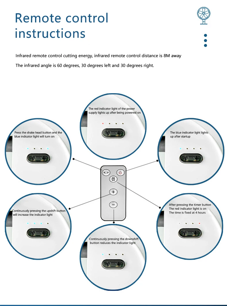 Timing can only be operated using the remote control. Press the "timing button" on the remote control, and the indicator light on the shaking head button will light up green. There is only one timing gear, which is fixed for 4 hours and can be turned on or off.