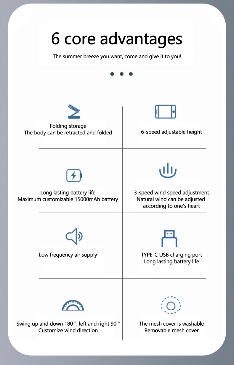 5) Upgraded all copper brushless motor and circulating fan blades, super quiet, strong wind, softer and quieter wind, long service life
